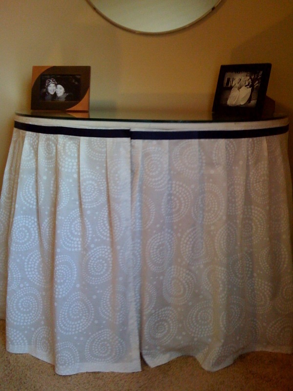 Today was a good day. I was able to finish sewing the skirt for the vanity that my mom gave me. It was made by her grandfather for her mother when she was young. I’ve made skirts for it before, but never with a machine. Usually just hand-stitching or rigging up something with fabric glue. I felt that they never really lived up to the original design and workmanship, so it has been naked for quite some time. I’ve had making one on my “101 things” list, in order to get myself motivated. Since I’ve figured out the sewing machine, aka Bro, I felt confident enough to give it another try. I went to Joann Fabrics to find the right material and decided to go with this white on white print. I like the whimsicality of the print, but felt that it was still subtle enough to be fairly neutral in case I move it to a different room or redecorate. I also decided to use some navy grosgrain ribbon on the upper edge to help finish it off and add a little color. I am super happy with how it turned out. (I personally think that the photo doesn’t do it justice!) Now I need to figure out what my next project will be. . .