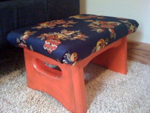 I went to Joanne Fabrics and found a little unfinished step stool made out of pine. It seemed sturdy and was just the blank canvas I was looking for. I brought it home and painted it with some red acrylic paint I had around, then rubbed on some copper acrylic paint to give it a distressed feel and to soften the brightness of the red. I then took an old towel that I had cut up for rags and stapled it to the top to give it a little padding. Next I covered that with some remnant fabric that I had stashed and stapled it over the towel. . . and Voila! I am thrilled with how well this turned out. It was SUPER easy and was a simple, cheap (under $20!!) and eco-friendly solution. I could imagine making this again for a gift for a child or fellow vertically challenged adult.