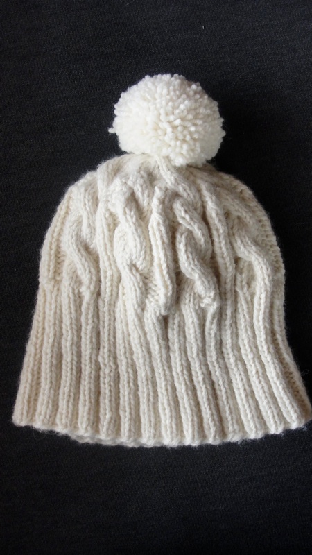 The hubby recently asked me to knit him a hat like the one he saw on some website. It was a basic cable-knit hat, so I thought that I’d be able to find a pattern for it. After a little searching on Ravelry, I found the Irish Hiking Hat . I decided to do a test run of the pattern before going to work on Shawn’s, so I picked up some Plymouth Encore Worsted that I had in my stash to see what I could do. I decided to double the yarn to give it a chunky, Irish sweater look. I feel like it turned out pretty well, except for the finishing on the crown came up to a little point – or like a nipple according to hubs- so I covered it up by adding a pom pom. I think that the pom makes it look like an old school ski hat. What do you think?
