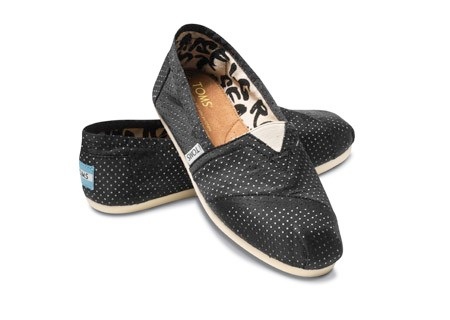I purchased a pair of TOMS last week and I have to say that I am totally in love with them! They are superbly comfortable and super cute. I picked out the classic style in black perforated nylon, called the Siebe. Inspired by the scuba divers, the lightweight nylon upper has great breathability (no sweaty toes) and it has an adorable polka-dotted effect from the cotton lining peeking through. I love the lining’s “Raise IQs, not sea levels” print as well. The EVA/rubber blend outsole is super cushy and feels like I’m walking on air.
