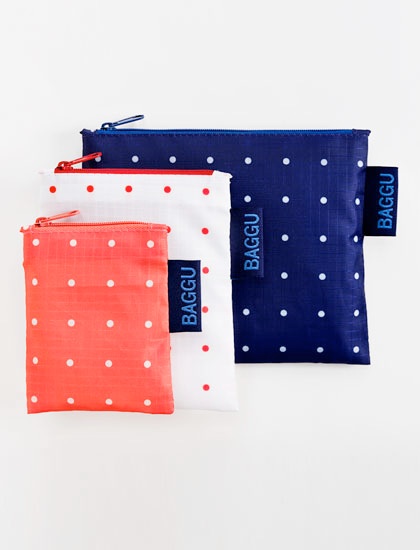 You all know how much I love my Baggu bags. Well, those wonderful Baggu people have come out with another must have item, the Baggu Zips. These adorable little zippered pouches are made out of the same ripstop nylon as the original bags and come in a plethora of colors and prints. (I’m pretty partial to the dots myself.) And are perfect to organize the detritus of our lives. They range in size from 3.25” x 4” to 12” x 15” so you can bag everything from earbuds, toiletries, cords and chargers to shoes, art supplies, or even a hairdryer. I suggest you pick some up soon, they’d make great stocking stuffers!