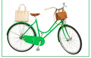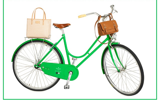 . . . with this bike! Kate Spade worked her magic on this gorgeously green Adeline Adeline bicycle. Wouldn’t it be so wonderful to tool around on this all summer? Notice that KS also designed a special essex scout satchel and bay street quinn you can clip to the handlebars and rear rack. Sadly, the limited edition, single speed, two-wheeler will be only be available at Kate Spade New York shops and at Adeline Adeline.