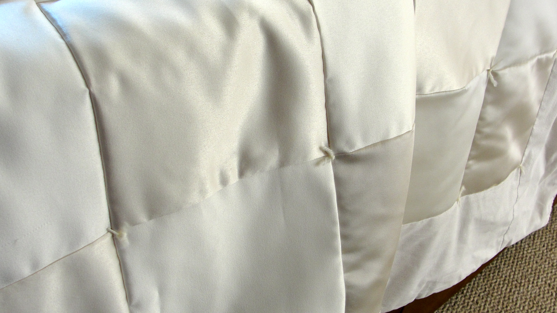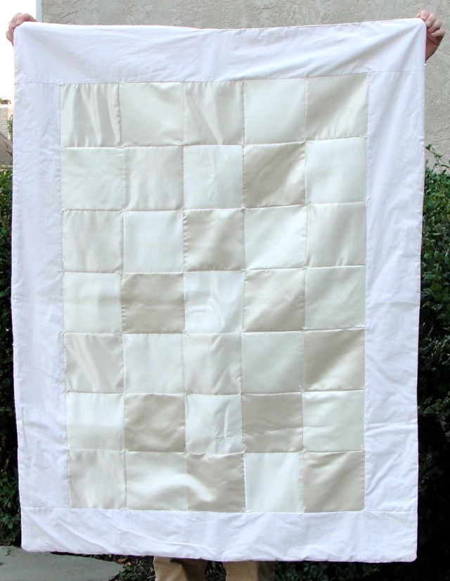 The fabric was really awkward pieces because 1. some were cut on the bias 2. some were from the dress being shortened 3. it is silk-satin, so difficult to cut & sew. Because of this, I decided to do a simple patchwork top, alternating the two different colors of silk. I made rails using a white-on-white pattern of quilters cotton that I had on hand and back it in Kona white cotton. I was crunched on time, so I decided to go with a no-binding quilt and hand-tie it versus machine quilting. This was my first time doing either, so there was a bit of a learning curve (read much seam ripping) however I am really happy with how it turned out. It’s much fluffier and has a softer look to it than machine quilting.