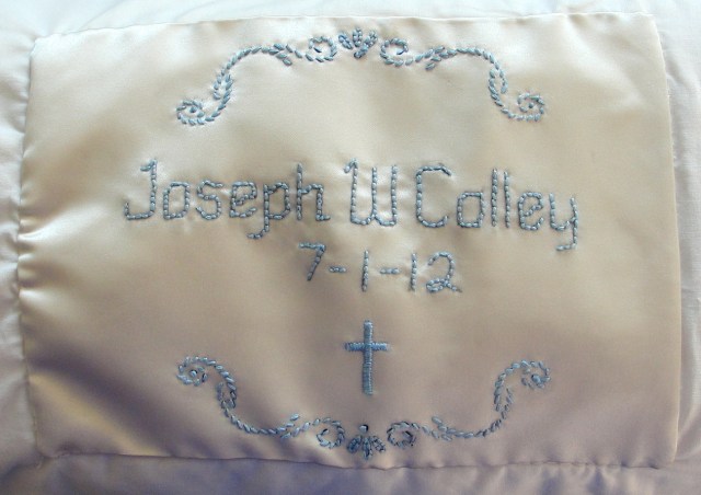 I also embroidered a patch for the back of the quilt using some of the silk-satin with Joseph’s name and the date of his baptism. The plan is to make additional patches for the back for any future babies. Hopefully, this is something that I can hand down in the family. I imagine someone in the future saying “Your great grandmother made this quilt out of her wedding gown, and now it’s your turn to have your name added on this special day.”