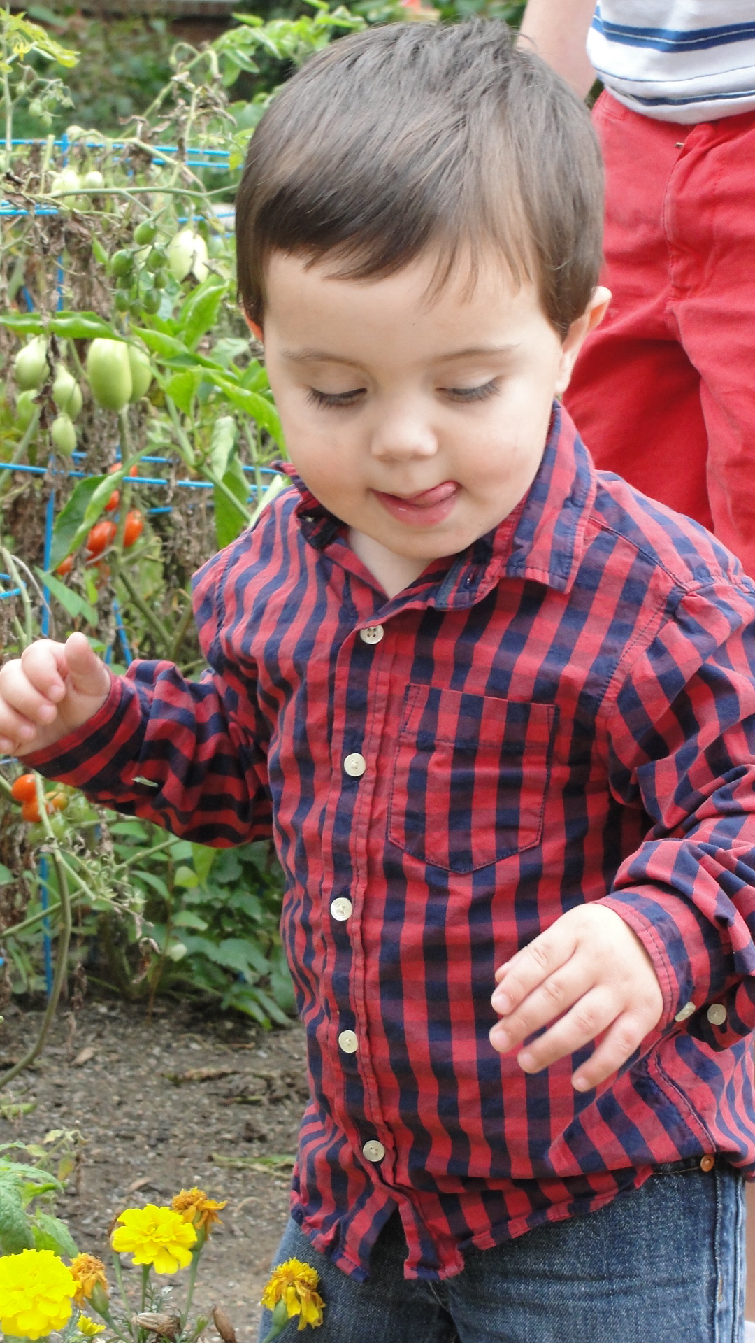Playing outside and helping in the garden is so much fun. I pick the tomatoes for mommy, but I don’t really like to eat them. I take a bite and then hand them over.