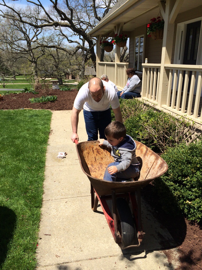I am so happy the weather is finally better. I help Grandpa and Dad with the yard work. I get to ride on Grandpa’s tractor and dad gave me a ride in the wheelbarrow. I also climbed up a huge mountain of mulch!
