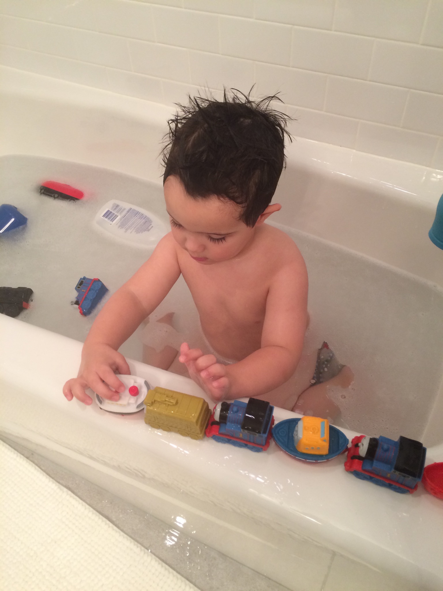 Now that the weather isn’t the best to go outside, I’ve really been having fun playing with play dough, painting, coloring, and doing other crafts with Mom. We also go down in the basement and make obstacle courses, play ball, and spend a lot of time playing with my trains. Daddy and I have fun wrestling and chasing each other and playing “rocket ship” too.