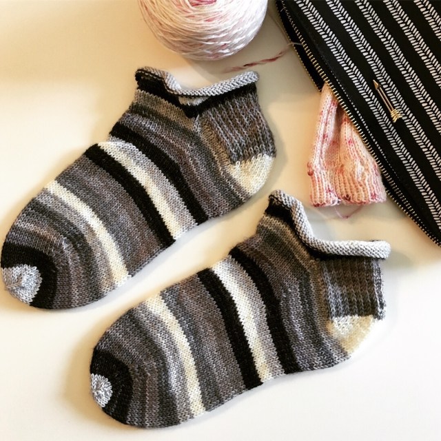 I finished these a couple months ago, but just realized I never posted about them. Shawn requested a pair of socks for his birthday and I thought this grayscale stripe, with the amazing name Eeyore’s rainbow, from Must Stash Yarns would be perfect. I love the pop of hot pink for the contrast cuff/heel/toe. It reminds my of Eeyore’s ribbon on his tail. I used this pattern again.