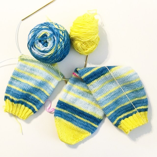 I always seem to have a pair of socks on the needles. I carry them with me and usually work on them while waiting at swim lessons, and oil change, etc. My current ones are self-striping yarn inspired by The Beatle’s song Yellow Submarine. Fitting since the movie is celebrating its 50th anniversary this year. No real completion goal for these, but I know they’ll be finished before school starts.