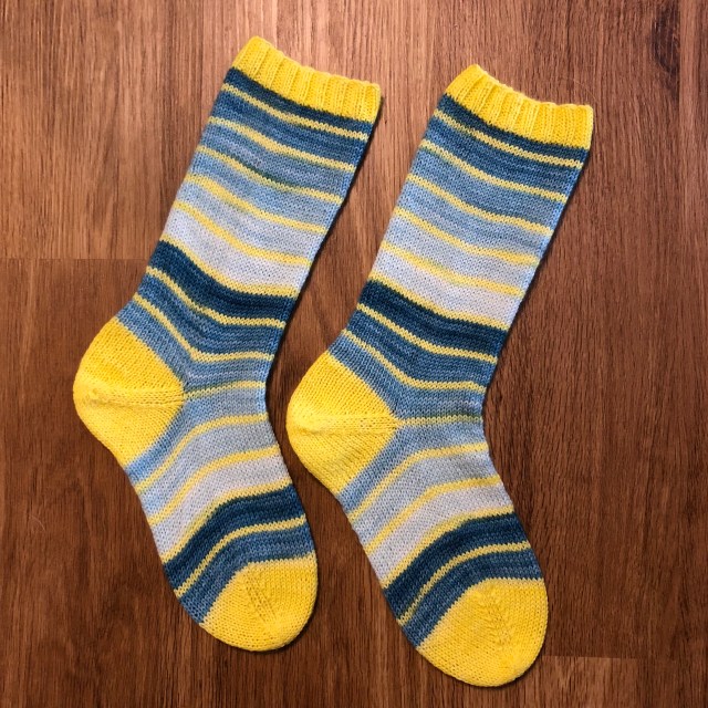 Knit with Must Stash Yarns self-striping yarn in Land of Submarines, that was part of her series inspired by The Beatles. I love the gradient of blues with the pops of bright yellow. These were worked on intermittently though most of the summer and were completed at the end of September.