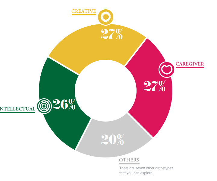 I came across this interesting website the other day. It’s called ArchetypeMe and it tailors a website to your own personality based on your results to a quiz regarding ten archetypes. You can also share your favorite things with your friends and others. It seems to be a bit like Pinterest that is more focused on your personality. I took the quiz, but decided to forgo the website part. I barely have time as it is to peruse the interwebs, so adding another site to my list is not happening. But it was fun to take the quiz! Here’s my results. Not really that surprising.