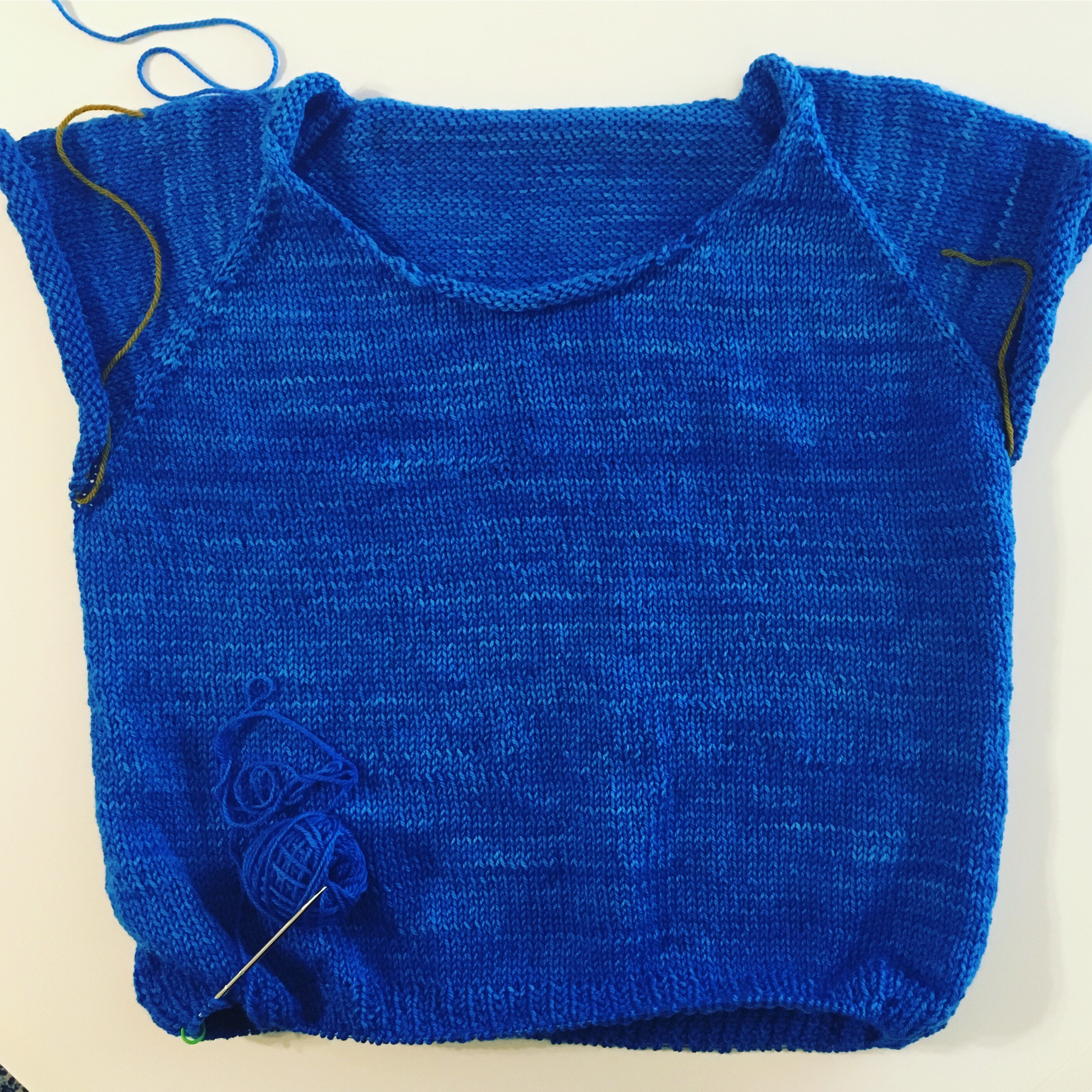 This worsted weight sweater is actually going fairly quickly. I cast on the first week of July as part of a KAL and I’m on track to finish by the August 10th completion date. I’m bit farther along than the photo, I finished the hem and started on the first sleeve.