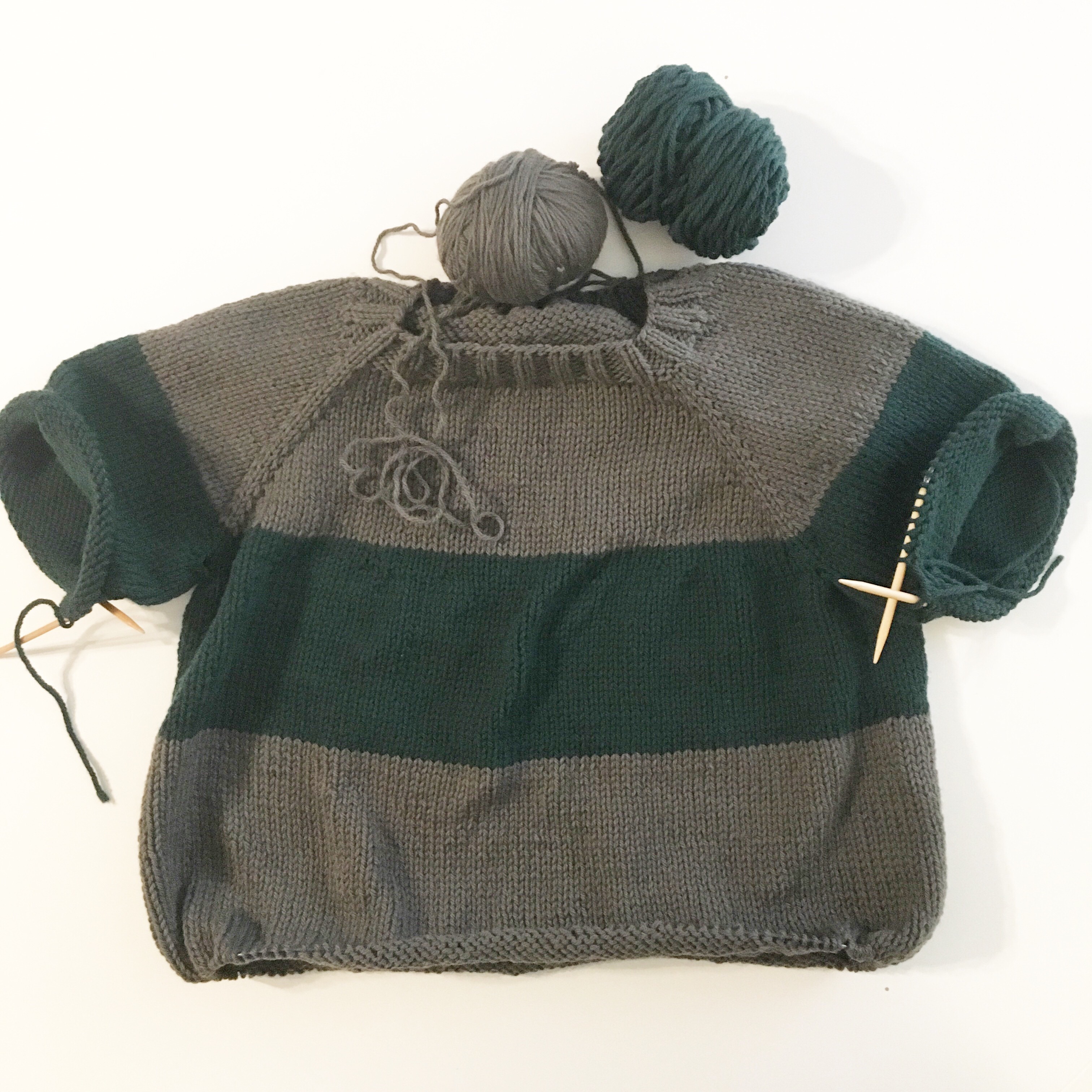 This striped worsted weight sweater is actually for Joey. I’m doing a striping sequence and to have the sleeves line up with the body, I’m working them all at the simultaneously. This is making it go faster and slower at the same time. I’m intentionally making a little too large for him right now to make sure it will still fit when sweater weather is here again I want to have this done before school starts as well.
