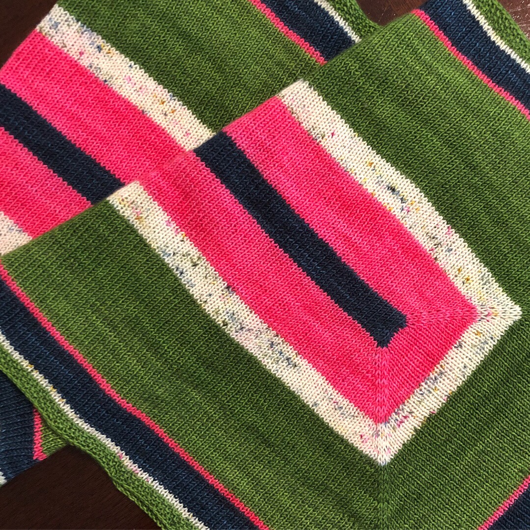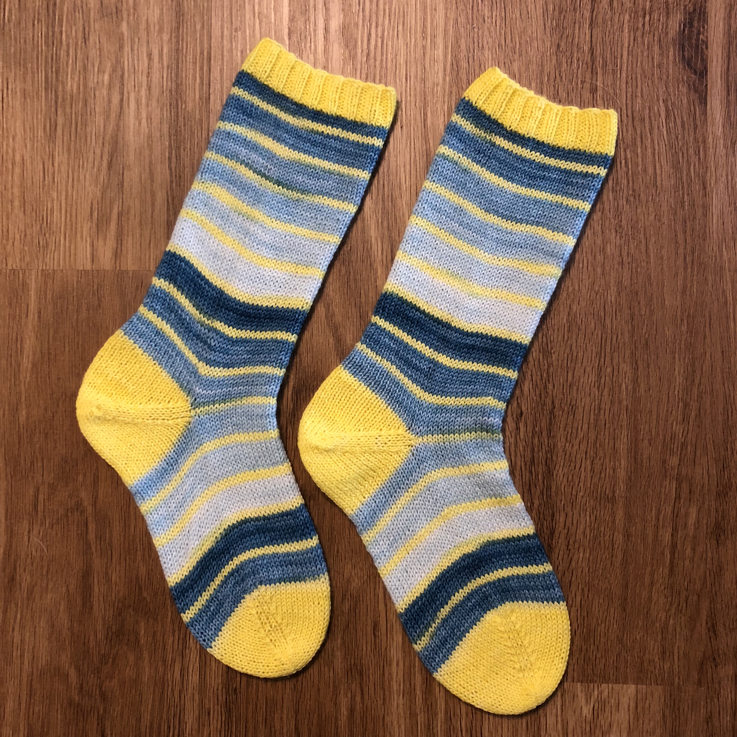 I always seem to have a pair of socks on the needles. I carry them with me and usually work on them while waiting at swim lessons, and oil change, etc. My current ones are self-striping yarn inspired by The Beatle’s song Yellow Submarine. Fitting since the movie is celebrating its 50th anniversary this year. No real completion goal for these, but I know they’ll be finished before school starts.