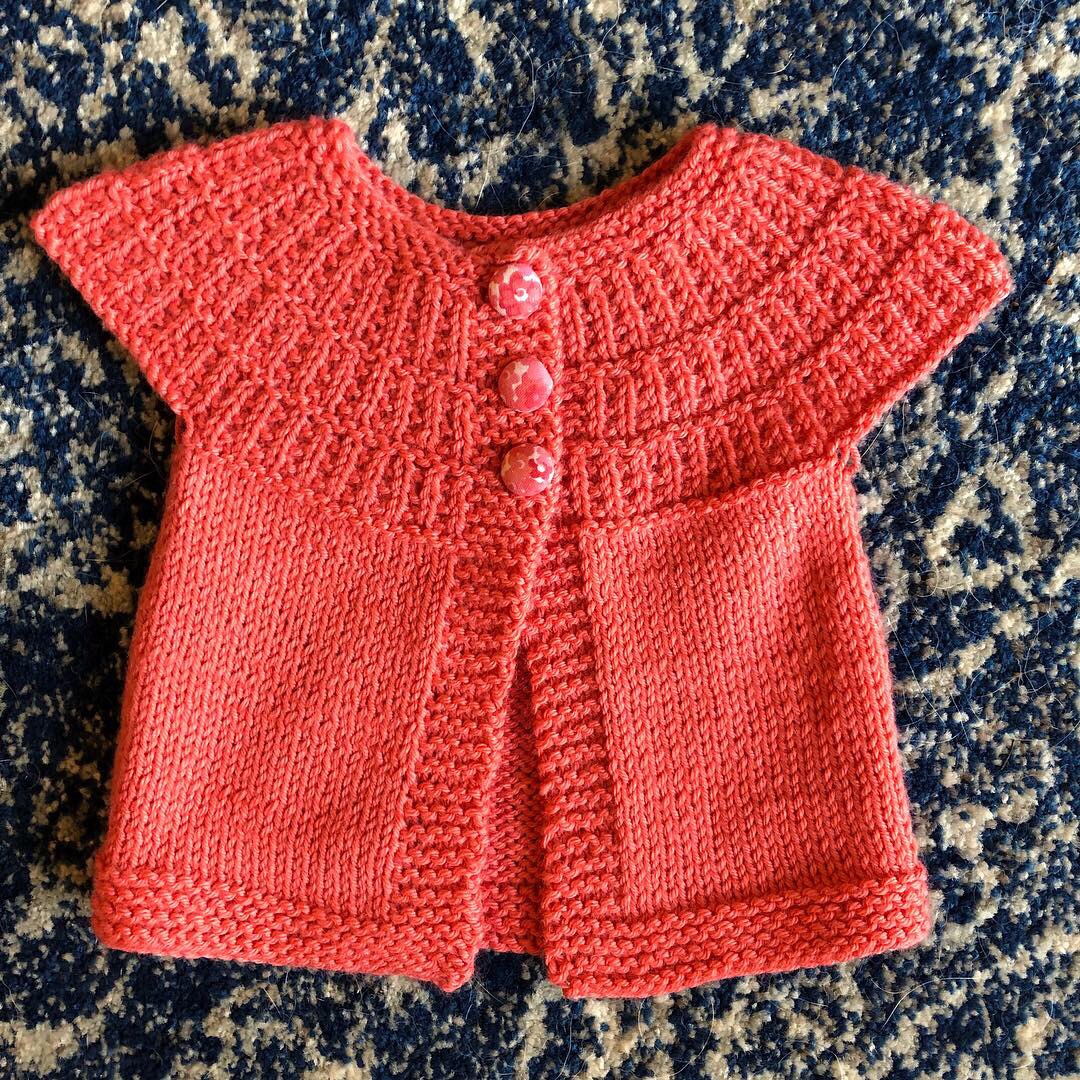 This cute little cardigan was made for a friend’s sweet baby girl. The pattern was easy and fun to knit. I forgot how fast it is to knit baby clothes! The yarn is CoopKnits Socks Yeah DK is this pretty coral color. I also made the buttons with some leftover calico and a button kit I’ve had from Joann’s.