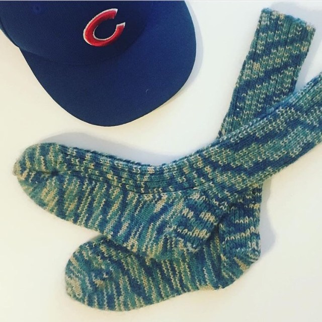 I started knitting these socks at the start of the Cubs post-season play. Filled with excitement and anxiety, it helped to keep my hands busy while watching the games. We kept advancing and I kept knitting. Every stitch is filled with joy, fear, anxiety, elation. Amazingly, I finished them at the end of the 9th inning. . . and the rest is history.
