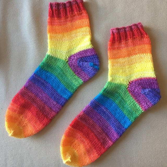March’s socks for Operation Sock Drawer are complete. I absolutely loved this self-striping sock yarn from Must Stash Yarn & Fiber. The color-way is Martian Rainbow, hence the name for this month. It was a bit addicting to watch the colors emerge (thrilling, I know) and blend from one to the next. This was a “perfect match” yarn, meaning that the skein was split in two and matched, making it possible to make the stripes align for both socks.  I used the Smooth Operators Socks by Susan B. Anderson. This is a top-down construction with an afterthought heel. (Full details on Raverly.)
