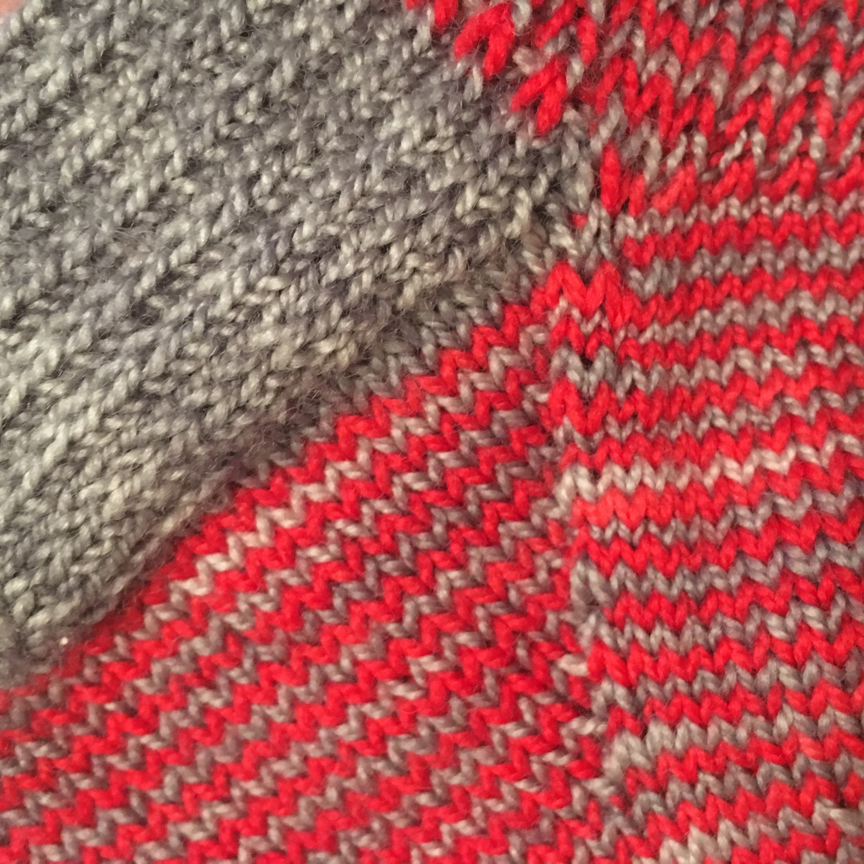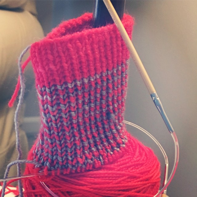 May’s installment for #operationsockdrawer was inspired by a stash dive. I have a relatively small amount of stashed yarn, but some of it is ancient. I had two skeins of Koigu Premium Merino, one scarlet and one gray, that I bought at Purl Soho back in 2010, I think. In honor of that trip, I decided to use their Striped Crew Sock pattern. I modified it by shortening the cuff to 4″ ( I just couldn’t handle the 1×1 ribbing with alternating yarn for much longer) and alternating the main color for the toes/heels. As always, full details are on Ravelry