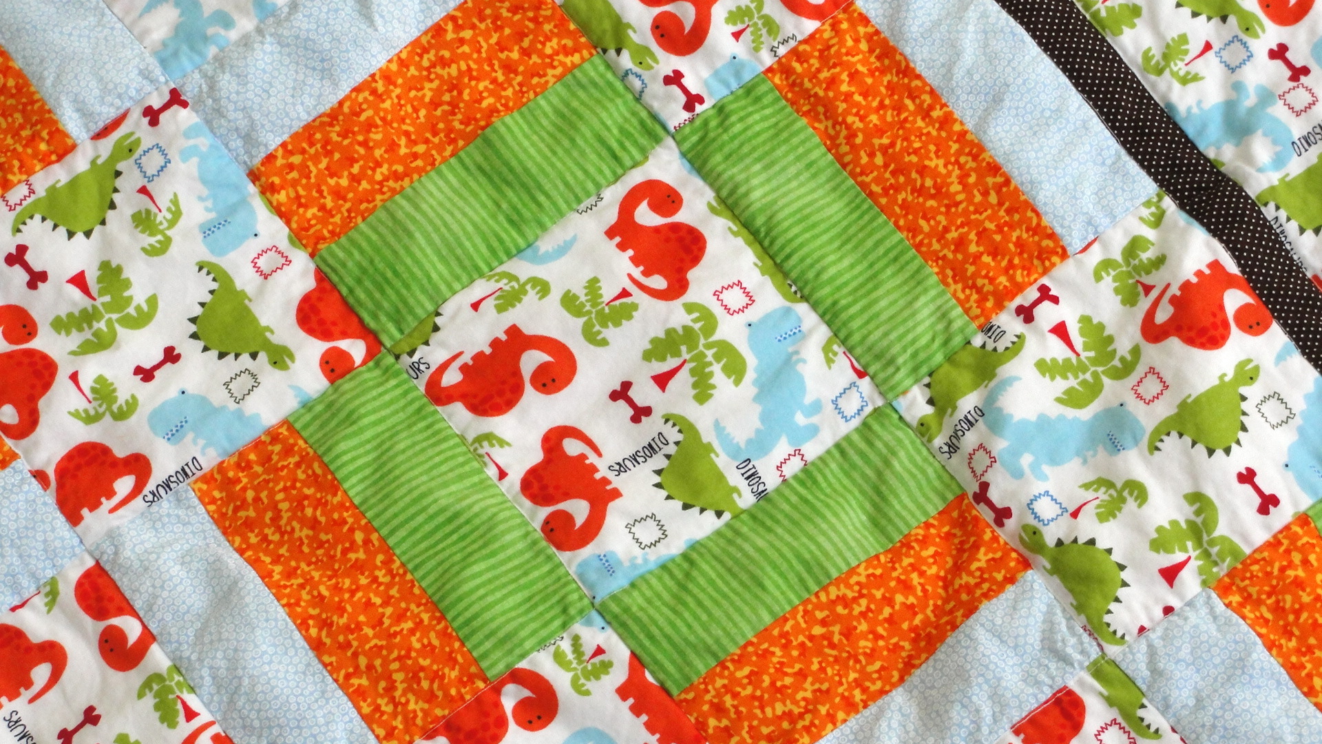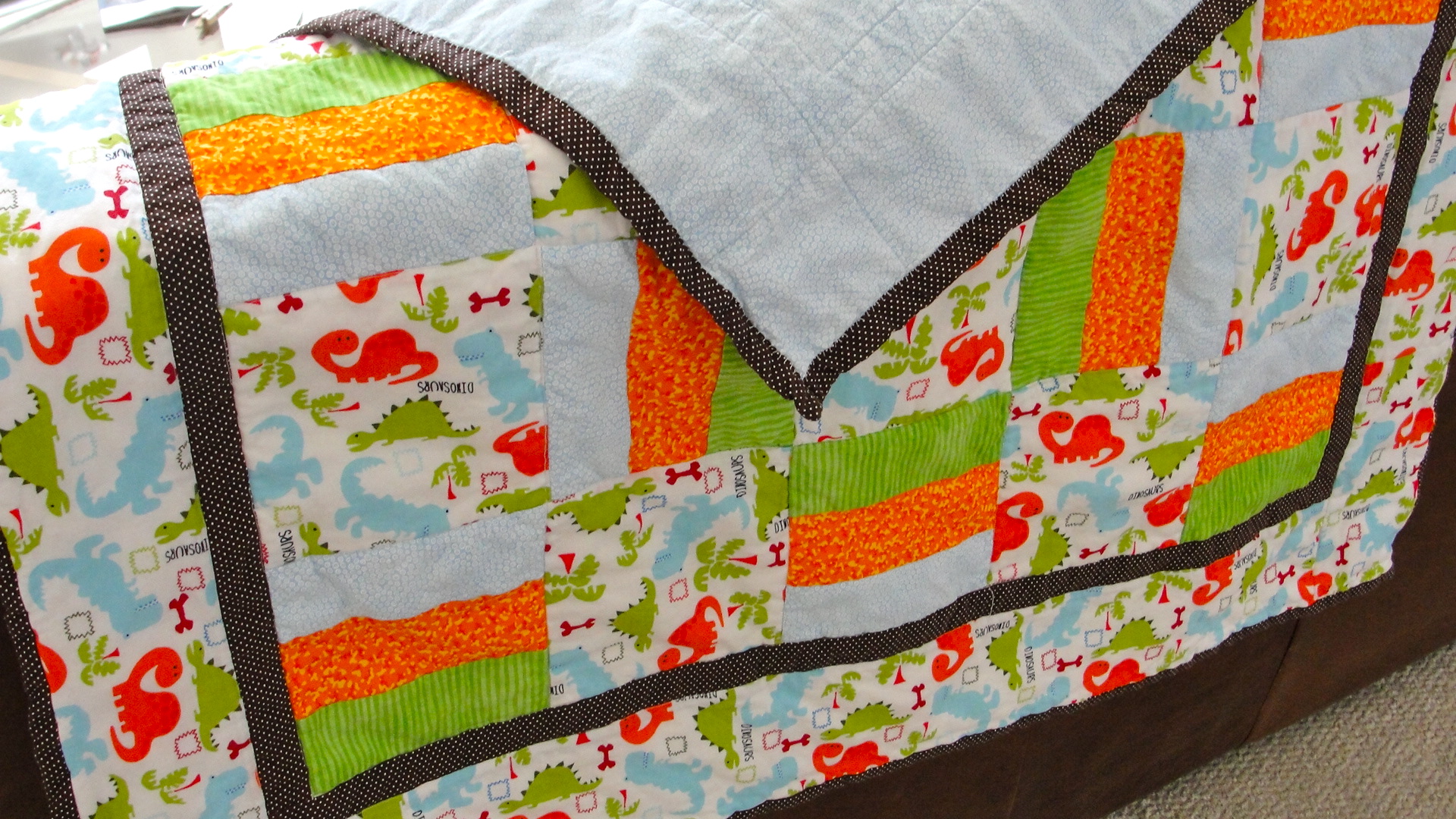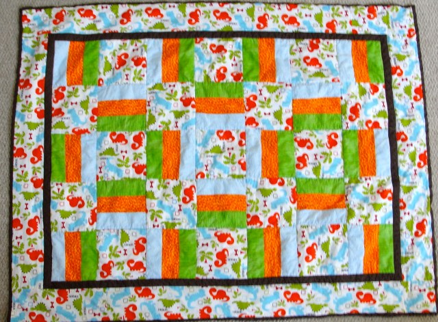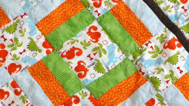 Here’s the quilt that I made for my sister, Rozalyn. I modified a pattern that I saw online, making the internal blocks larger. The majority of the fabric I used was left over from Lucy’s quilt. Roz really loved the colors and fabric when I showed it to her, so I knew that she’d be happy with this one. I added the espresso micro-dot fabric to tone down some of the pink. This came together fairly quickly since I already had some of the fabrics cut into squares and strips. I backed it with green minky that matches the colors from the front of the quilt. I also used this machine binding technique that I found on Pinterest. It looks great with the accent color in the binding, but was a bit time consuming. I might try it again when I wouldn’t be so crunched for time.