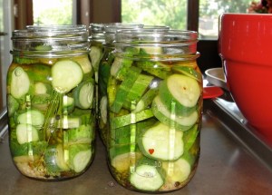 The other recipe that I used was for Spicy Bread & Butter pickles. These have a sweet yet tart, taste that ends with a spicy finish. Deelicious! They are a bit easier to make, since you do not have to deal with the water bath part, but they don’t last as long. I made a small batch of these, since I am the only pickle lover in the house. Here’s the recipe: